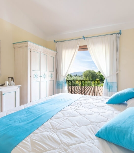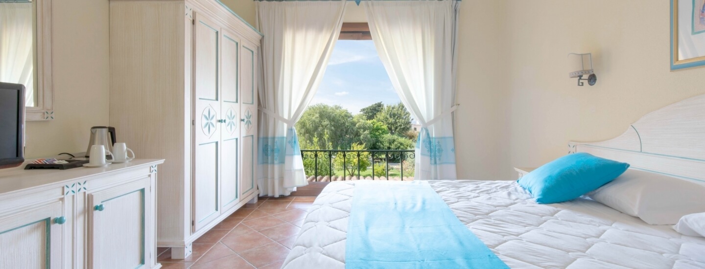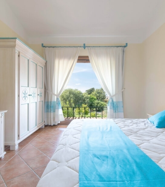 Ampia e luminosa, elegantemente arredata in tipico stile sardo con colori caldi e accoglienti, è dotata di balcone o veranda coperta attrezzata rivolta verso il mare o la piscina. Può ospitare da 2 a 4 persone.