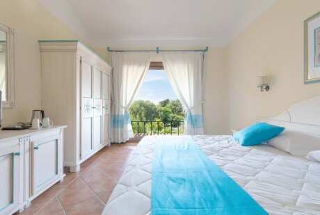 Spacious and bright, elegantly furnished in typical Sardinian style with warm and welcoming colours, it has a balcony or covered veranda facing the sea or the swimming pool. It can accommodate from 2 to 4 people.
