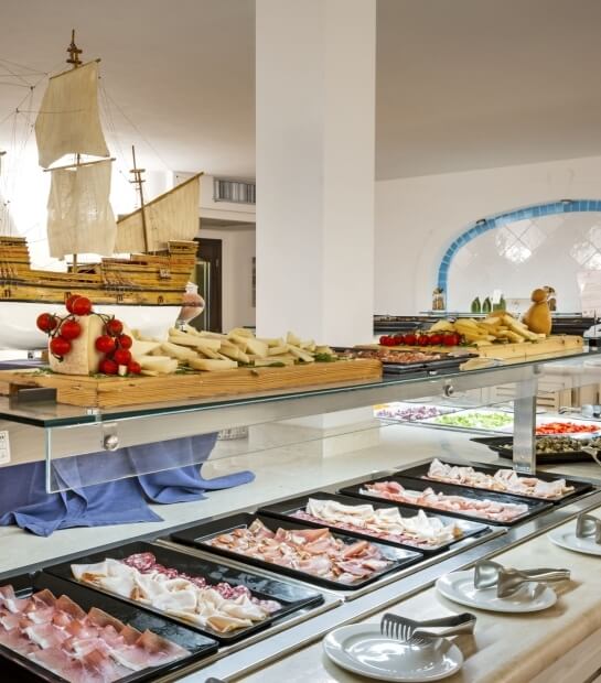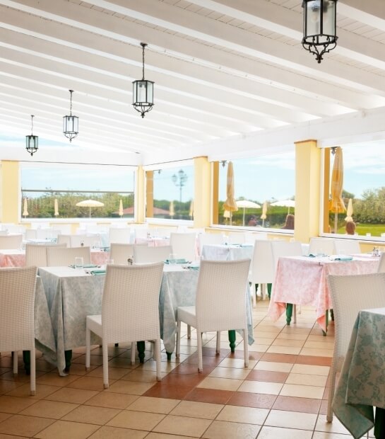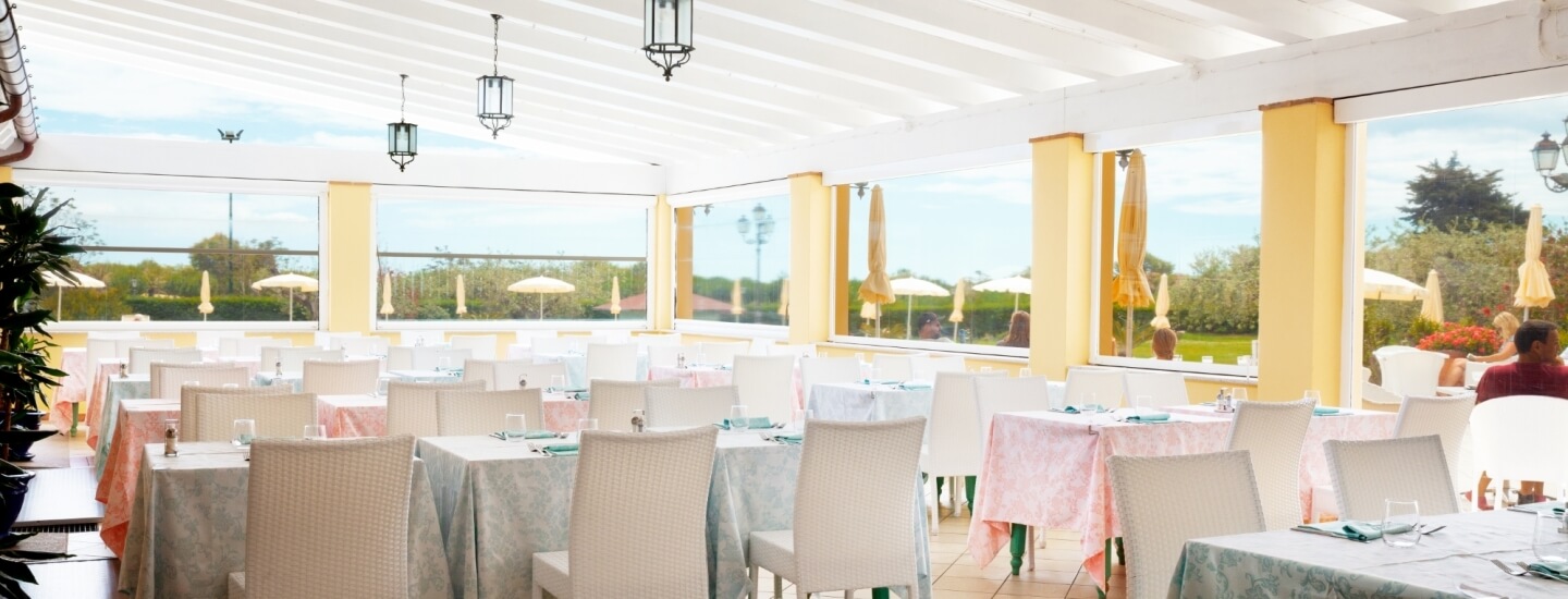 Ristorante con servizio a buffet per colazione, pranzo e cena con posti a sedere interni ed esterni.